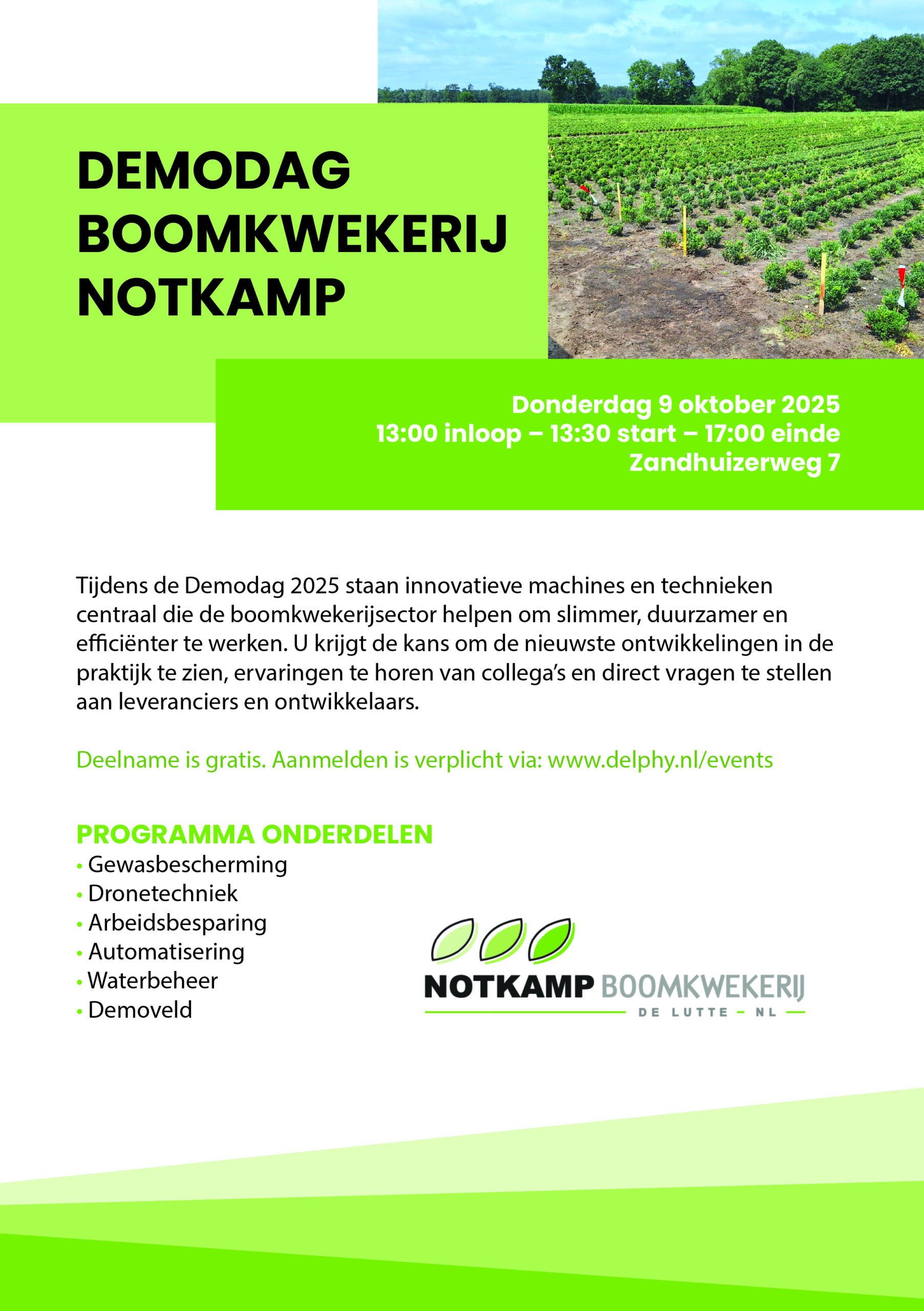 Op donderdag 9 oktober bent u van harte welkom bij de Demodag 2025 van Boomkwekerij Notkamp in De Lutte. Tijdens deze middag staan innovatieve machines en technieken centraal die de boomkwekerij slimmer, duurzamer en efficiënter maken. U ziet de nieuwste ontwikkelingen in actie, hoort ervaringen van collega’s en kunt rechtstreeks in gesprek met leveranciers en ontwikkelaars.