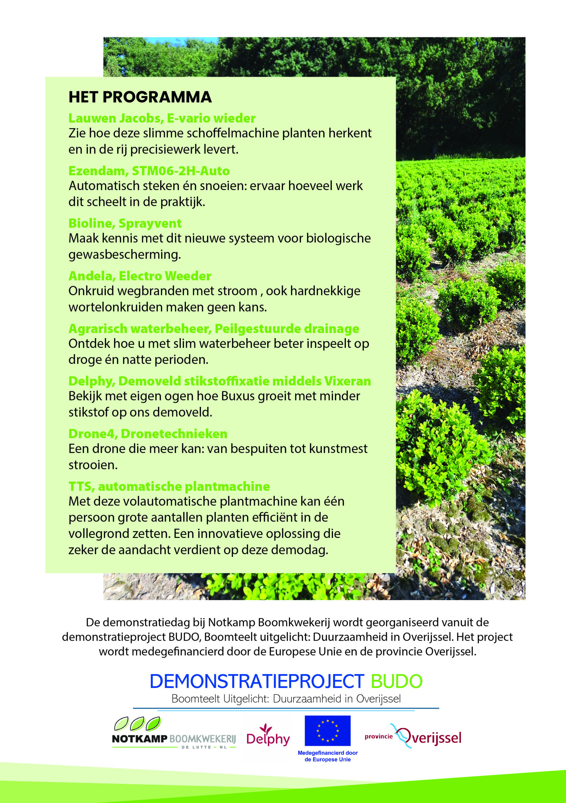 De demonstratiedag bij Boomkwekerij Notkamp wordt georganiseerd vanuit het demonstratieproject BUDO – Boomteelt uitgelicht: Duurzaamheid in Overijssel.
